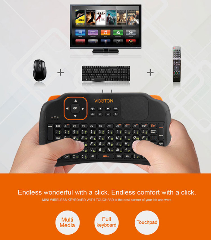 Радиоклавиатура Viboton S1 является отличным решением ввиду отсутствия проводов. С ее помощью вы сможете управлять телевизорами, приставками, планшетами, ноутбуками, проекторами и ПК под управлением Windows, Android, Linux. Дальность ее работы составляет 20 м.