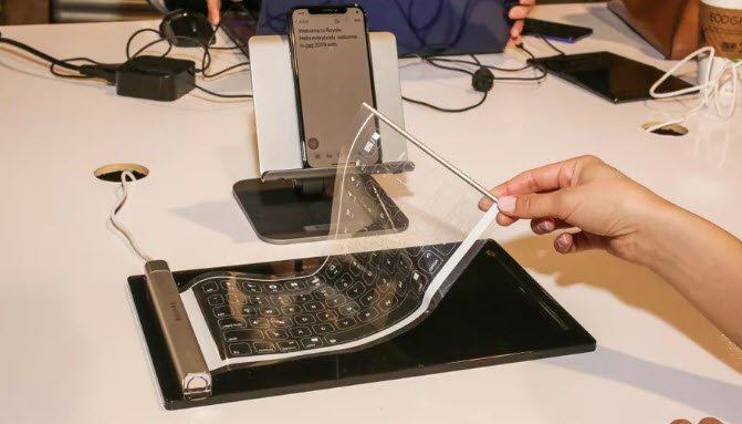В рамках CES 2019 была анонсирована QWERTY-клавиатура Royole Rollable Keyboard, которая сворачивается в свиток. Визуально новинка представляет собой прозрачную пленку, на которой белым цветом нанесены полноразмерные кнопки.