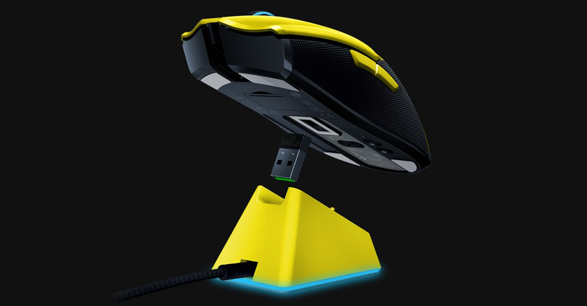 Razer Viper Ultimate Cyberpunk 2077 Edition выглядит очень стильно благодаря сочетанию желтого и черного цветов, а также подсвечиваемому логотипу Razer. Зарядка киберпанк-мыши осуществляется на специальной док-станции, которой девайс и комплектуется. Время автономной работы находится на уровне 70 часов в режиме игры.