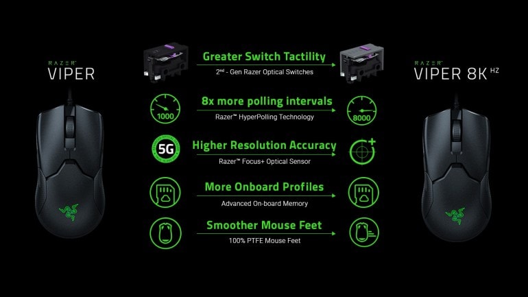 Кроме того, как упоминалось выше, в Razer Viper 8KHz используется технология HyperPolling с частотой опроса 8000 Гц (скорость в 8 раз выше, чем у других ведущих игровых мышей). Частота опроса — это, в основном, частота, с которой мышь сообщает свое положение подключенному устройству, то есть компьютеру. Кроме того, технология Razer позволяет пользователям испытывать задержку до 0,125 мс.