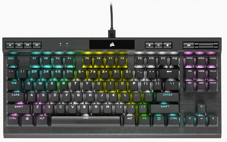 Клавиши украшены индивидуально программируемой подсветкой RGB, которую можно настраивать с помощью программного обеспечения Corsair iCUE. Настройки клавиатуры можно сохранять во встроенной памяти (до 50 профилей). Для тех, кто участвует в турнирах, есть «турнирный переключатель» на задней панели. Он мгновенно выбирает статичный цвет подсветки и отключает макросы. Оснащение клавиатуры включает мультимедийные клавиши и алюминиевый ролик регулировки громкости.