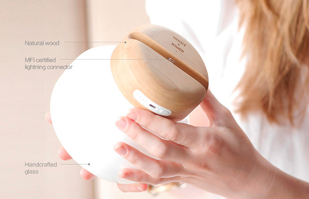 Лампа-павербанк выполнена в форме гриба, она состоит из стеклянной колбы и деревянной основы, в которой имеется отверстие для установки на зарядку смартфона.