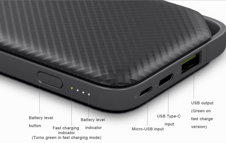 Павербанк имеет стандартный USB-выход для высокоскоростных зарядных устройств 9V/2A. Он также имеет порты USB Type-C и microUSB, которые поддерживают быструю зарядку 9V/2A, что позволяет заряжать устройство за 3,5 часа. Чтобы отслеживать уровень заряда предусмотрен специальный индикатор быстрой зарядки. Когда используется быстрая зарядка, индикатор горит зеленым цветом.
