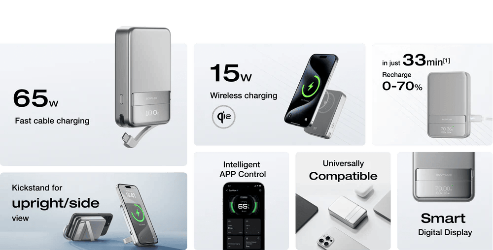 Новинка имеет встроенный кабель USB-C, дисплей и складную подставку. Ее вес составляет 258 г, а толщина — 0.9 дюйма. Поддерживается Bluetooth, доступно управление через приложение EcoFlow.