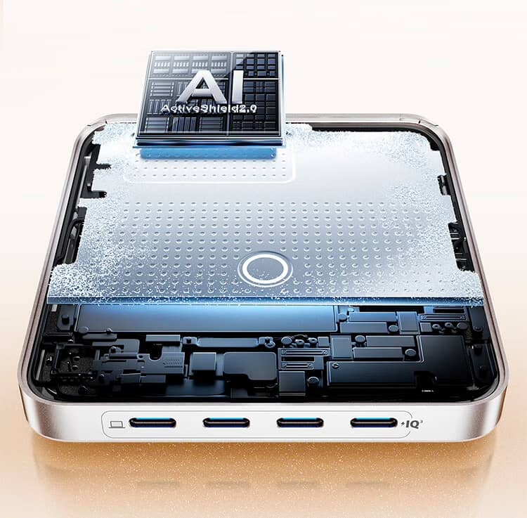 Зарядное устройство оснащено четырьмя портами USB-C и двумя USB-A, заключено в корпус с металлической рамкой, а также поддерживает технологию ActiveShield 2.0.