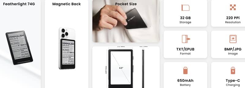 Габариты Xteink X4 составляют всего 114 х 69 х 5.9 мм при массе 74 г — примерно как у тонкого картхолдера. Благодаря магнитам ридер легко крепится к iPhone или другим телефонам с совместимым магнитным чехлом, но при необходимости его можно использовать и как самостоятельную компактную книгу.