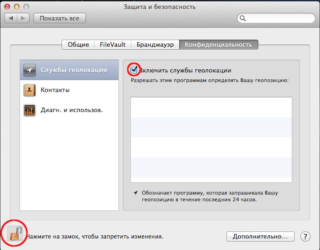 Идем в «Системные настройки» –> «Защита и безопасность». Там нажимаем на замочек, вводим администраторский пароль и ставим галочку напротив пункта «Включить службы геолокации». Теперь ваш Mac позволит определять свое местоположение.