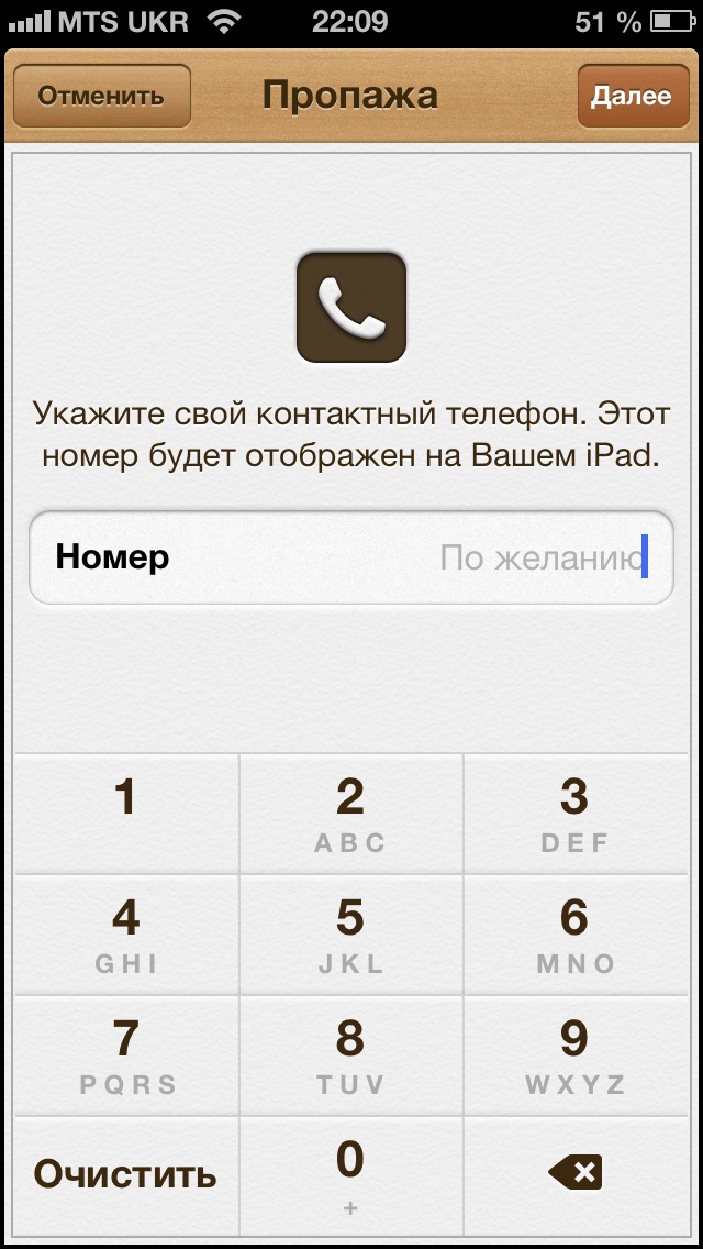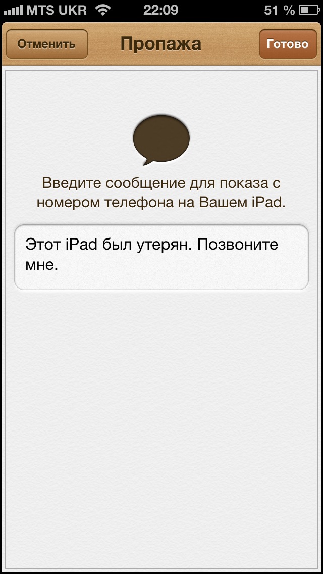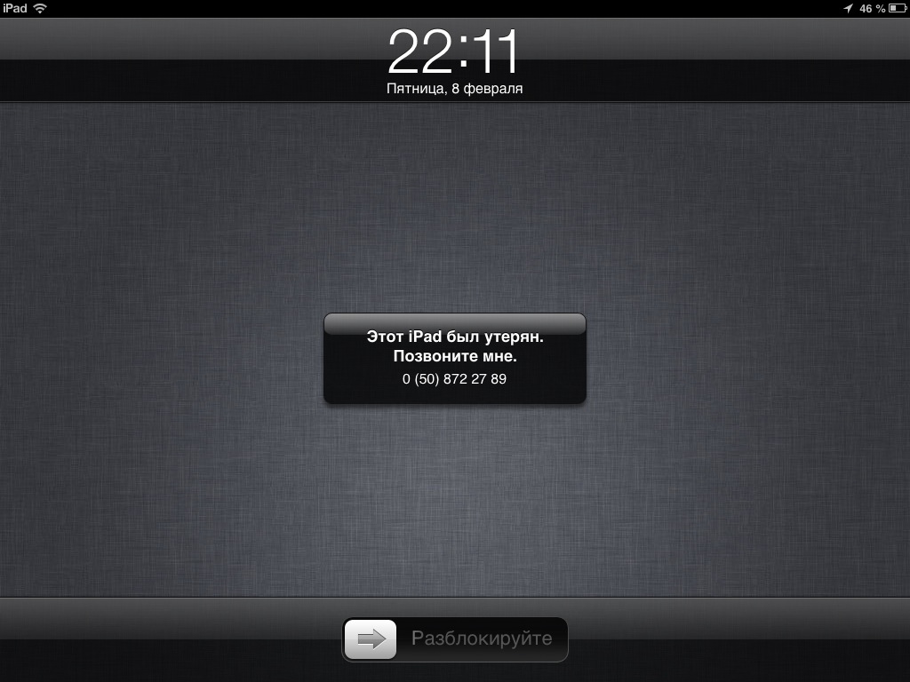После этих действий на вашем iPad появляется сообщение, что девайс был утерян, и просьба перезвонить на указаный телефон. Возможно, что нашедший будет порядочным человеком и действительно вас наберет.