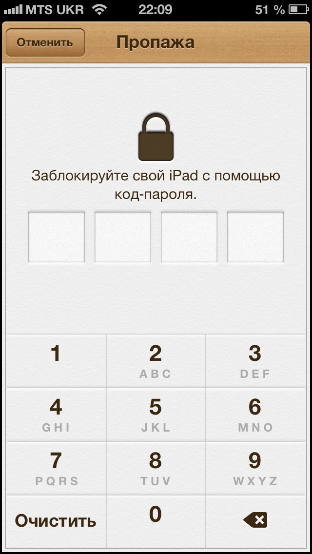 Нажимаем соответствующую кнопку, вводим пароль, которым мы хотим заблокировать iPad. По желанию можно прикрепить сообщение и номер для связи.