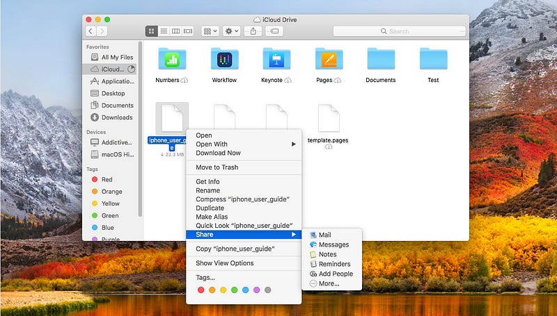 Если у вас есть учетная запись iCloud, вы можете легко обмениваться файлами с вашими контактами. Откройте Finder и выберите нужный файл в iCloud Drive. В верхней части окна Finder нажмите кнопку «Share (Поделиться)» — она выглядит как стрелка, указывающая из окна вверх, и выберите «Add People (Добавить людей)». Затем вы можете использовать следующее диалоговое окно для выбора метода совместного доступа, получателей файла и т.д..