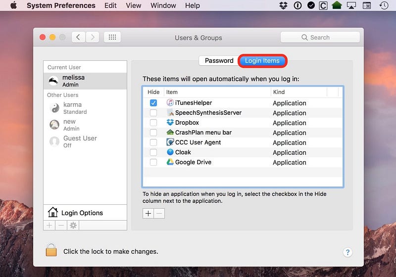 Каждый раз, когда запускается macOS, она может автоматически запускать определенные программы. Хотя это удобно, но слишком много приложений в автозапуске могут повредить общую производительность системы. Чтобы проверить приложения автоматического запуска и отредактировать список, откройте «Системные настройки» и выберите «Users & Groups (Пользователи и группы)». Под заголовком «Login items (Элементы входа)» вы можете удалить приложения с помощью кнопки «минус» или добавить новые приложения с помощью кнопки «плюс».