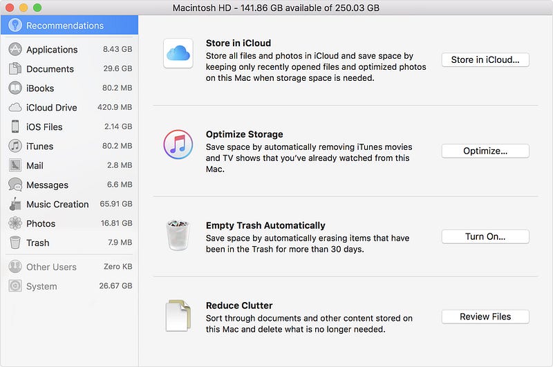 Чтобы автоматически удалять облачные файлы, не требующие локального хранилища, такие как телешоу iTunes, фильмы iTunes и вложения электронной почты, выберите «Optimize (Оптимизировать)». Если вы предпочитаете ручное управление, выберите «Review Files (Обзор файлов)», чтобы проверить самые большие файлы в вашей системе и решить, стереть их или нет.