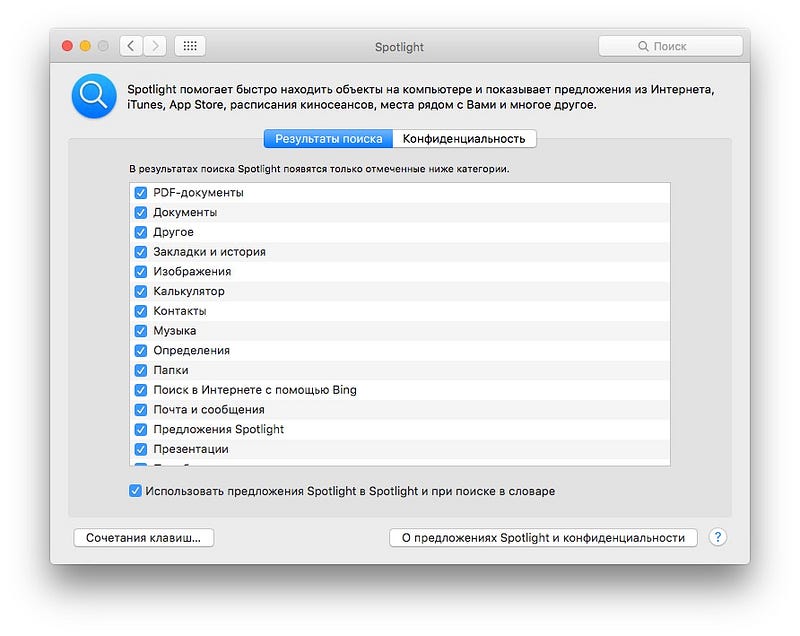 Инструмент поиска Spotlight, который вы запускаете с помощью Cmd + Space, позволяет находить что-либо на вашем Mac. Но иногда его параметры поиска настолько широки, что у вас будут проблемы с выбором объекта поиска. Чтобы немного ограничить границы поиска, откройте «Системные настройки» и выберите «Spotlight», а затем «Результаты поиска». Отключите любую из менее релевантных категорий, которую вы хотите, чтобы Spotlight не учитывал ее в результаах поиска.