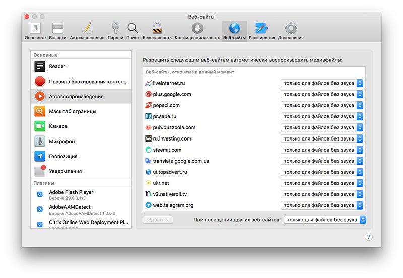 Автозапуск рекламы и видеороликов может сделать Интернет шумным местом. Чтобы остановить их, откройте веб-браузер от Apple, нажмите Safari из панели вверху страницы, потом «Настройки» и перейдите на вкладку «Веб-сайты». Здесь вы можете остановить автоматическое воспроизведение аудио и видео в будущем или заблокировать видео, которые имеют звук.