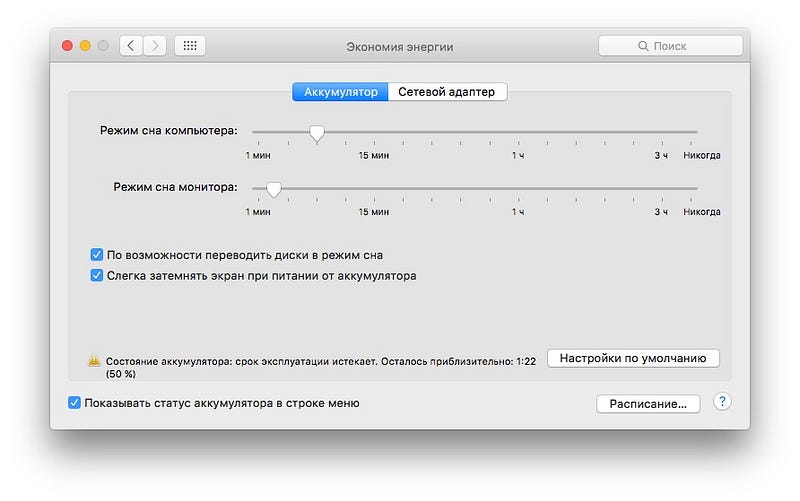 На ноутбуке, таком как MacBook, одним из самых больших источников расхода батареи является дисплей. Чтобы сохранить заряд, вы можете заставить компьютер быстро «заснуть» после периода бездействия или сделать так, чтобы экран слегка тускнел при работе от аккумулятора. Откройте «Системные настройки» и перейдите в «Энергосбережение», чтобы поиграть с этими настройками и продлить срок службы батареи.