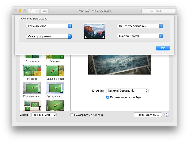 Перемещая курсор в разные углы экрана, вы можете запускать такие действия, как показ рабочего стола, запуск заставки, включение дисплея в режим сна или открытие диспетчера управления (что обеспечивает просмотр всех открытых окон). Но сначала вы должны настроить эти ярлыки. Откройте «Системные настройки», выберите «Desktop & Screen Saver (Рабочий стол и заставка)», перейдите на вкладку «Screen Saver (Заставка)» и нажмите «Hot Corners (Активные углы)». Теперь вы можете решить, какую функцию с каким углом связывать.
