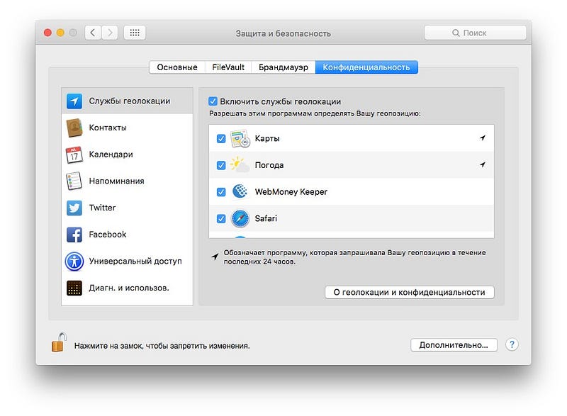 Такие сервисы, как карты и погода, должны иметь доступ к вашему местоположению, чтобы помочь вам ориентироваться и подготовить вас к дождливому дню. Но они не единственные приложения, которые могут видеть, где вы находитесь. Чтобы узнать, какие из них имеют доступ к этой информации, и заблокировать те, которым вы не доверяете, в «Системных настройках» перейдите в раздел «Защита и безопасность». В этом меню откройте «Privacy (Конфиденциальность)» и выберите «Location Services (Службы геолокации)», чтобы просмотреть список приложений.