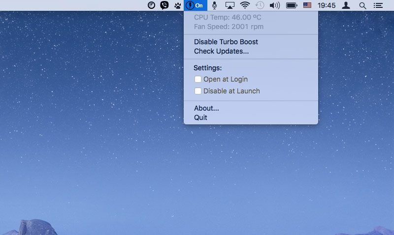 После запуска программы вы увидите значок с изображением молнии. При нажатии на иконку активируется выпадающее меню, в котором отображается температура процессора и обороты кулера. Чтобы управлять Turbo Boost, нажмите соответственно Enable Turbo Boost или Disable Turbo Boost.