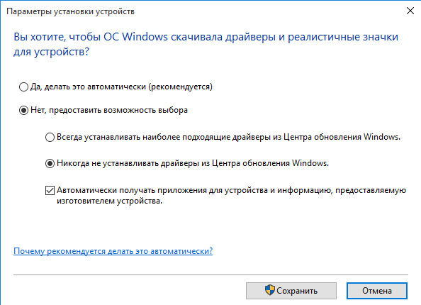 На панели «Параметры установки устройств» надо выбрать пункт «Нет, предоставить возможность выбора», далее — «Никогда не устанавливать драйверы из Центра обновления Windows». После этого нажмите кнопку «Сохранить» для подтверждения своего намерения.