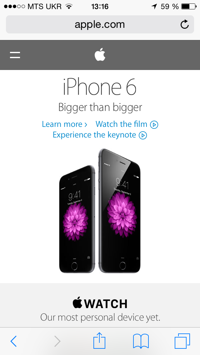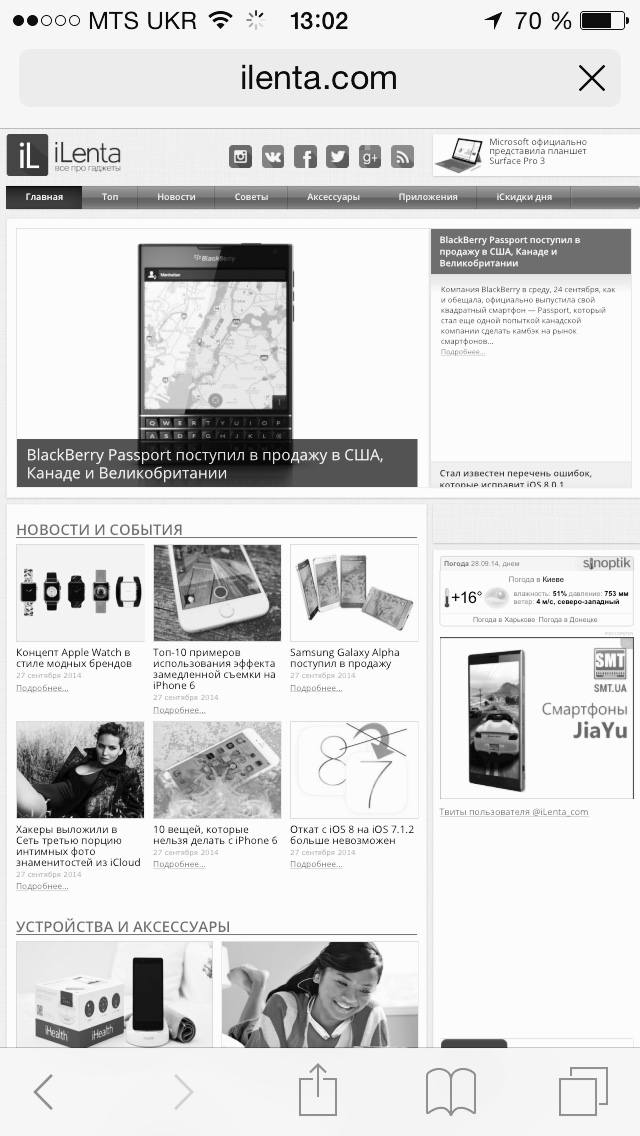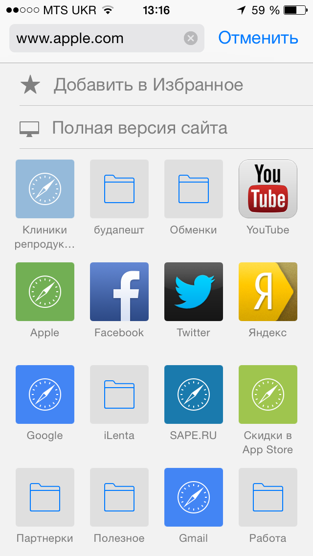 В iOS 8 вы можете легко переключиться на полную версию сайта, если вам принудительно подсовывают мобильную. Для этого тапните по адресной строке, а когда появятся плитки избранных сайтов, сделайте свайп вниз и нажмите кнопочку Полная версия сайта.