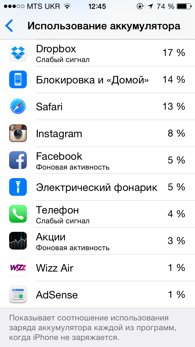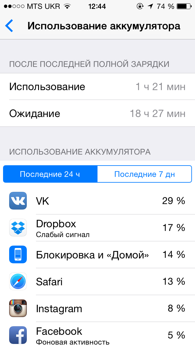 Помните подробную статистику использования данных сотовой сети, показывающую сколько трафика израсходовало то или иное приложение? Теперь точно так же можно просматривать какие приложения больше всего расходуют батарею и в два счета вычислять таких «обжор». Открываем Настройки — Основные — Статистика — Использование батареи и смотрим.