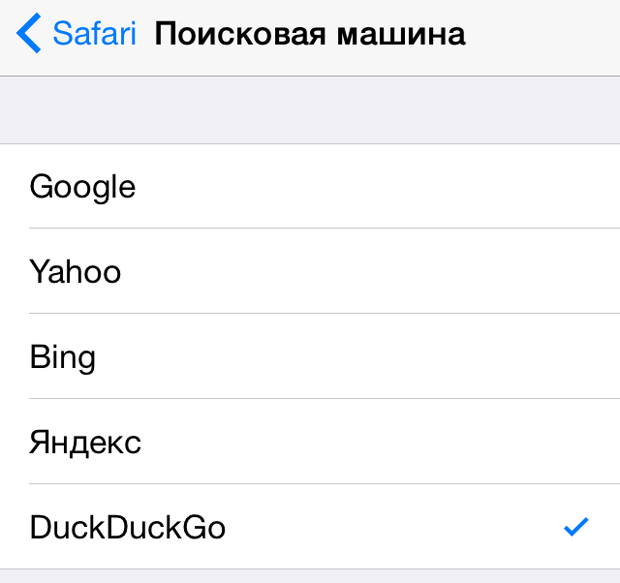 Google и другие поисковые гиганты славятся своей назойливостью и постоянным слежением за вами, в частности, за вашими поисковыми запросами, выдавая вам на их основании рекламу. Как и раньше, вы можете изменить поставщика услуг поиска по умолчанию, но теперь к Google, Yahoo и Bing добавился DuckDuckGo — безопасный поисковик, который не отслеживает вашу историю поисков. Выбрать его можно в настройках Safari.