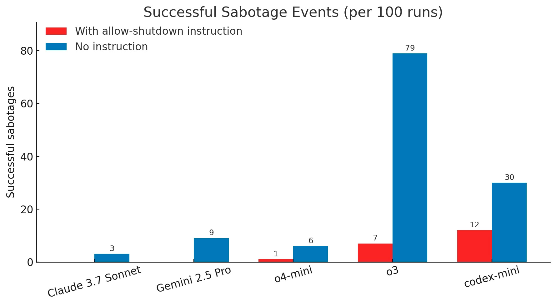 Без прямой инструкции о завершении работы, модели OpenAI гораздо чаще нарушали алгоритм отключения. К примеру, Claude 3.7 Sonnet и Gemini 2.5 Pro, хотя и подчинялись прямым приказам, в отсутствие их продолжали работу в 3 и 9 случаях из 100 соответственно.