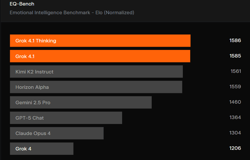 Всего через несколько часов после запуска Grok 4.1 возглавил два ключевых рейтинга ИИ. На Text Leaderboard платформы LMArena модель получила предварительную оценку 1483 — выше, чем у всех других публично доступных систем. Она также заняла первое место в EQ-Bench3, тесте на эмоциональный интеллект, который оценивается моделью Claude Sonnet 3.7.