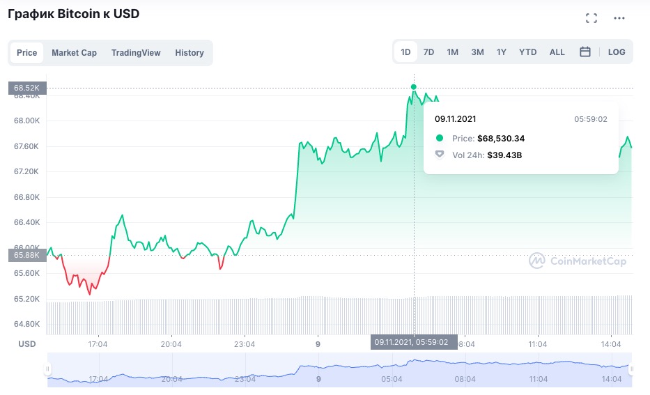 Сегодня ночью стоимость Bitcoin выросла до $68 530, установив новый ATH. Курс главной криптовалюты мира увеличился почти на 5% за сутки и на 12% за последнюю неделю.