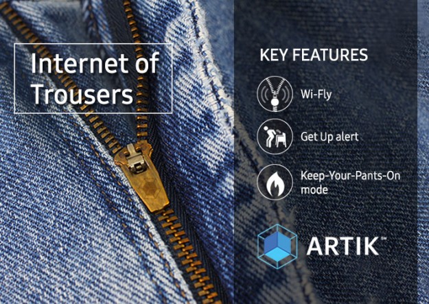 Второй шуткой оказался анонс новой линейки «умных» IoT-продуктов Samsung Internet of Trousers, в числе которых джинсы разных фасонов с огромным количеством функций.