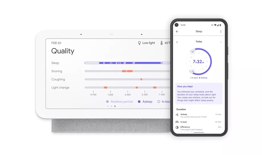 Главная новая функция Nest Hub второго поколения — это определение сна. Используя функцию Motion Sense, работающую от низкоэнергетического радара Soli на передней панели устройства, новый Nest Hub может отслеживать движения вашего тела, когда вы спите рядом с устройством. Функция определения сна может отслеживать такие вещи, как кашель и храп, а также изменения света и температуры в комнате с помощью микрофона, датчиков света и температуры.