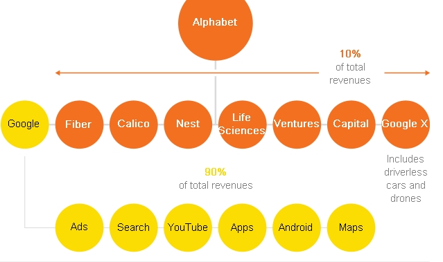 Alphabet будет зарабатывать на сервисах Google, которые приносят ей 90% прибыли. Остальные 10% — это результаты экспериментальных компаний и других подразделений, которые обозначены оранжевым цветом