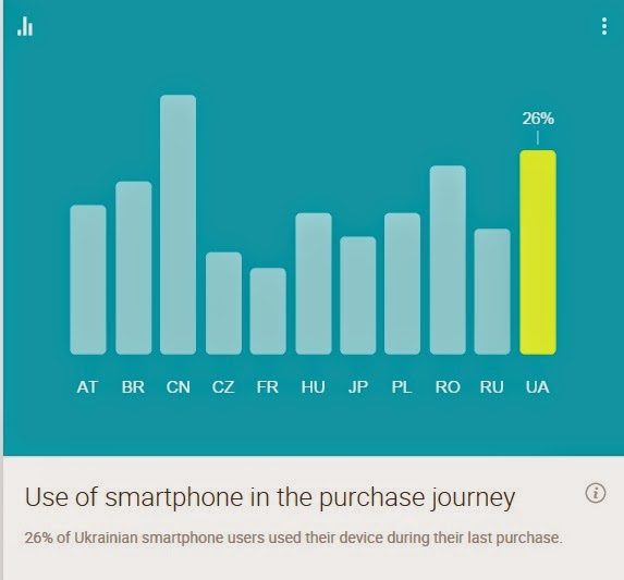 Барометр поведения Интернет-пользователей очередной раз подтвердил тенденцию, что Интернет играет важную роль в процессе поиска информации перед покупкой — 45% респондентов использовали Интернет для сравнения вариантов и предложений, прежде чем принять окончательное решение о покупке. 26% опрошенных украинцев использовали свой смартфон или для осуществления последней покупки, или для поиска информации о продуктах перед покупкой. Для сравнения этот показатель в Китае составляет 33%, Польше — 18%, России — 16%, Франции — 11%.