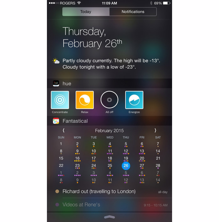 Philips Hue – один из первых виджетов для iOS 8. Утилита позволяет добавить в Центр уведомлений блок для управления «умными» лампами Hue. Одним жестом пользователь может получить доступ к фирменным осветительным приборам Philips. Клиент бесплатный.