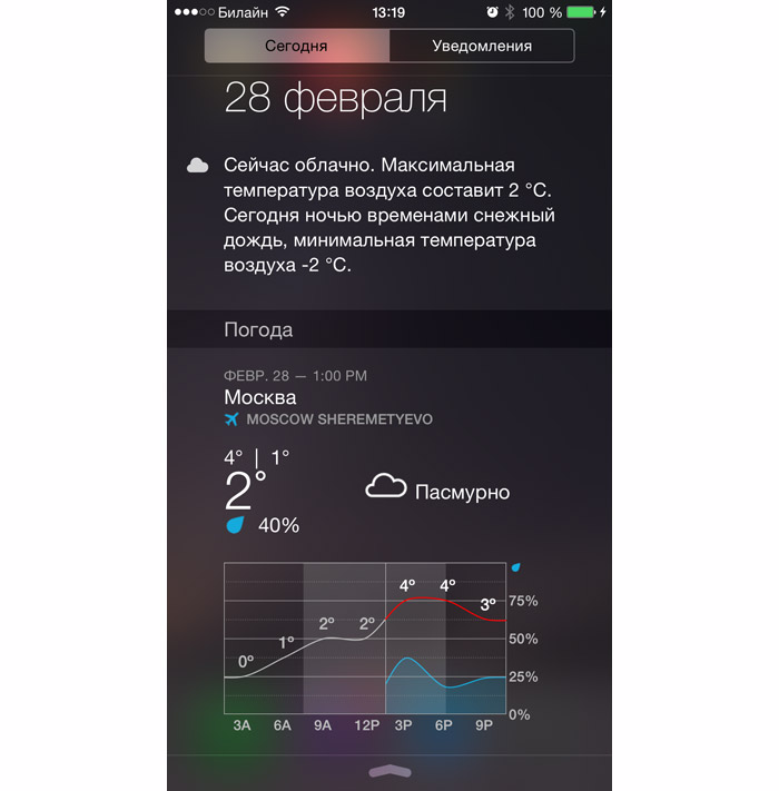 Метеоинформер Weather Underground содержит два погодных виджета с детальным прогнозом на 12 часов. Чтобы узнать температуру окружающего воздуха, облачность и влажность, достаточно бросить взгляд на Центр уведомлений. Приложение бесплатное.