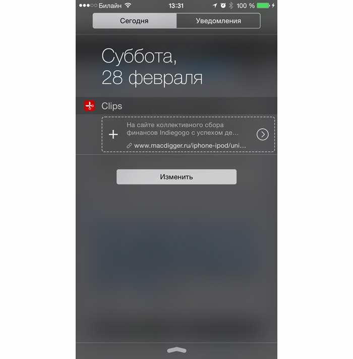 Это полезный виджет для работы с буфером обмена в iOS 8. Скопированные части текста можно быстро вставить в сообщение, перенести в Evernote, добавить в качестве задания в Clear, отправить по почте, через iMessage, сохранить в Dropbox и т.д. Приложение доступно бесплатно.