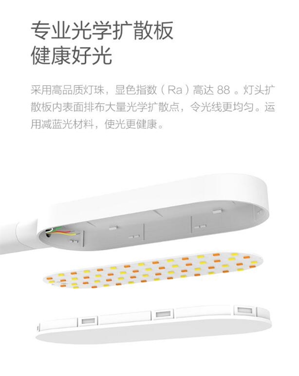 Устройство умеет регулировать уровень яркости и имеет пять регулируемых цветовых температур. В наличии 60 встроенных высококачественных светодиодных лампочек, из которых 30 работают в теплых и 30 в холодных тонах. Лампа способна обеспечивать яркость до 260 люмен.