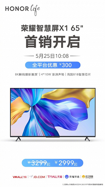 В данный момент для приобретения доступна лишь версия Honor X1 Smart TV с 65-дюймовым дисплеем. Первые покупатели смогут приобрести устройство по цене $420, после чего ценник вырастет до $462.