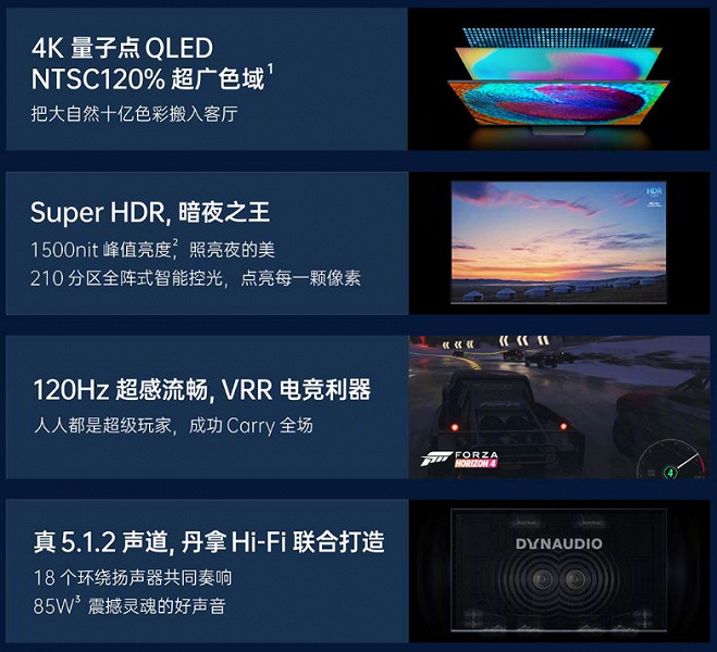 В телевизоре применена акустическая система формата 5.1.2 из 18 громкоговорителей с поддержкой Dolby Atmos. В наличии Wi-Fi 6, NFC, 8.5 ГБ ОЗУ, 128 ГБ флэш-памяти, выдвижная камера. Поддерживается голосовой помощник Breeno.