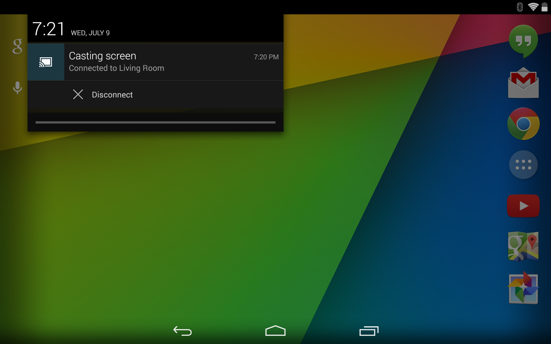 Чтобы функция заработала необходимо в приложении Chromecast выбрать пункт Cast Screen, а затем соединиться с гаджетом. Обладателям Nexus возможность трансляции доступна с панели быстрых настроек.