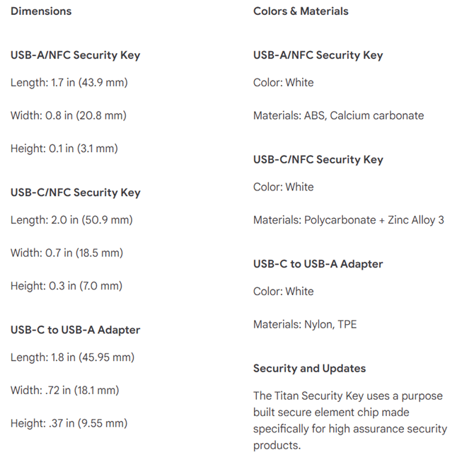 Titan Security Key выпущен в версиях с USB-A и USB-C. Обе оснащены NFC для быстрого подключения к мобильным устройствам. С возможностью хранения более 250 уникальных парольных ключей, новинки являются лучшими среди ключей безопасности FIDO2.