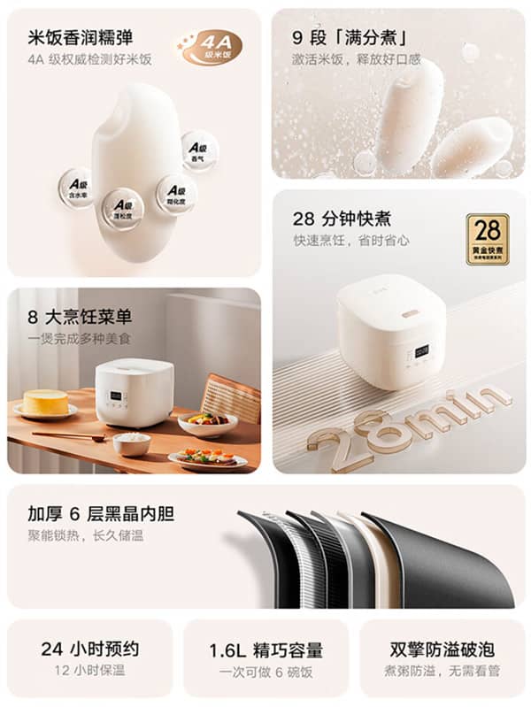 Рисоварка Xiaomi MIJIA N1 1.6L сохраняет фирменный семейный дизайн, имеет округлую форму, способна приготовить до 6 чашек риса за один раз. Внутренний котелок изготовлен из композитных материалов и имеет толщину 1.7 мм. Внутренняя часть котелка покрыта антипригарным слоем.