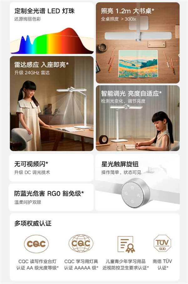 Индивидуально настроенные светодиоды имеют цветовую температуру до 4000K и индекс цветопередачи Ra97, обеспечивают сниженный пик синего света. Лампа предлагает уровень защиты от синего света RGD и сертифицирована TUV SUD. Продукт соответствует стандартам гигиенической сертификации для предотвращения миопии и связанных с ней проблем как у детей, так и у взрослых.