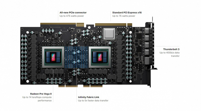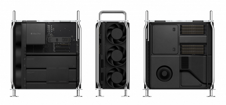 Новый Mac Pro в общей сложности обладает восьмью неравномерно размещенными слотами PCIe. В случае с использованием двух видеоускорителей Radeon Pro Vega II Duo, заняты будут четыре нижних слота PCIe. Видеокарты и процессор получили пассивные охладители, а обдувом занимается общая система, включающая несколько вентиляторов.