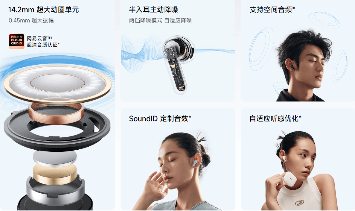 Наушники поддерживают активное шумоподавление, имеют двойной микрофон с AI для защиты от ветра при звонках, обеспечивая максимальный эффект шумоподавления до 9 м/с. Новинка предлагает пользовательские звуковые эффекты SoundID, адаптивную оптимизацию слуха и пространственный звук для сбалансированного звукового вывода.