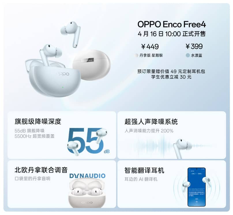 Наушники Oppo Enco Free 4 уже доступны для предзаказа в Китае. Старт продаж намечен на 16 апреля 2025 года. Стоимость версии Star Ceramic Silver составляет около $61, а Water Blue — около $55.