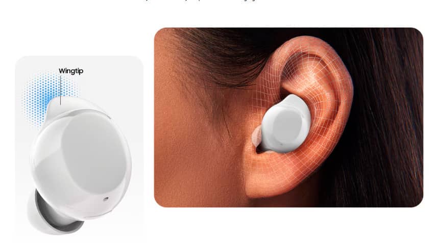 Форма наушников — без ножек, как у Buds FE, с фирменными фиксирующими «крылышками» для надежной посадки. Зарядный кейс — глянцевый, с портом USB-C и поддержкой беспроводной зарядки. Конструкция защищена от пыли и влаги по стандарту IP54.