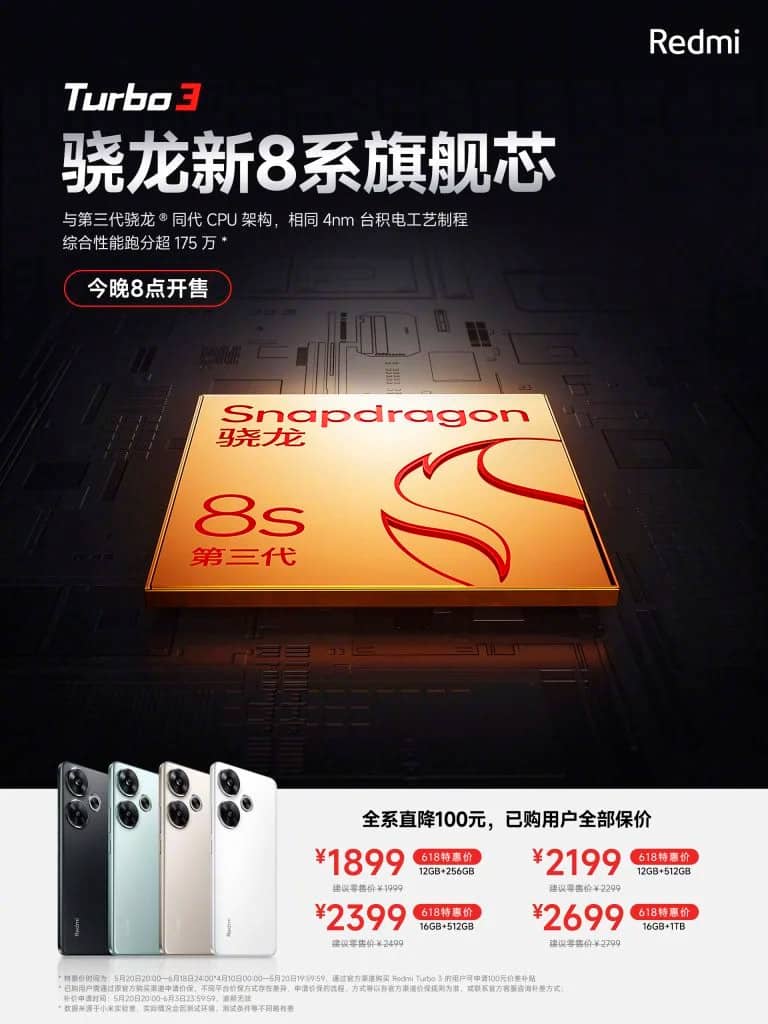 Redmi Turbo 3, напомним, оснащен 6.67-дюймовым OLED-дисплеем с разрешением 1.5K и частотой обновления 120 Гц, 20-Мп фронтальной камерой, основной камерой с 50-Мп и 2-Мп датчиками, чипом Snapdragon 8s Gen 3, оперативной памятью LPDDR5x, встроенной памятью UFS 4.0, аккумулятором емкостью 5000 мАч с поддержкой быстрой зарядки мощностью 90 Вт. Устройство работает на Android 14 с оболочкой HyperOS.