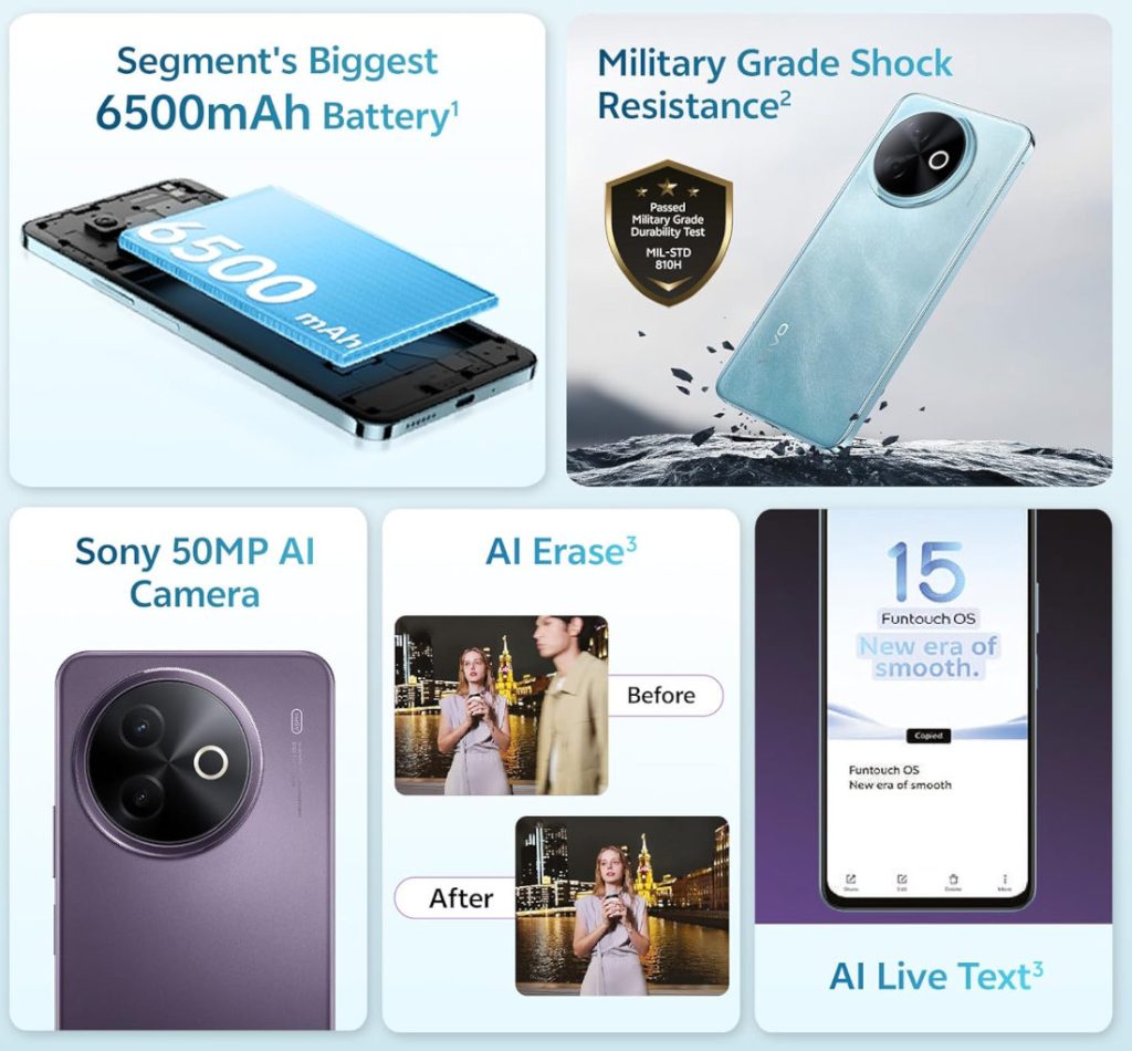 На задней панели Vivo Y39 расположена двойная камера: основной сенсор на 50 Мп и дополнительный на 2 Мп. На передней панели находится 8-Мп камера для селфи. Среди других примечательных особенностей — военный стандарт защиты MIL-STD-810H, рейтинг IP64 (защита от воды и пыли), боковой сканер отпечатков пальцев, поддержка двух SIM-карт, Bluetooth 5 и защитное стекло SCHOTT Xensation α. Устройство работает на Android 15 с фирменной оболочкой FuntouchOS 15.