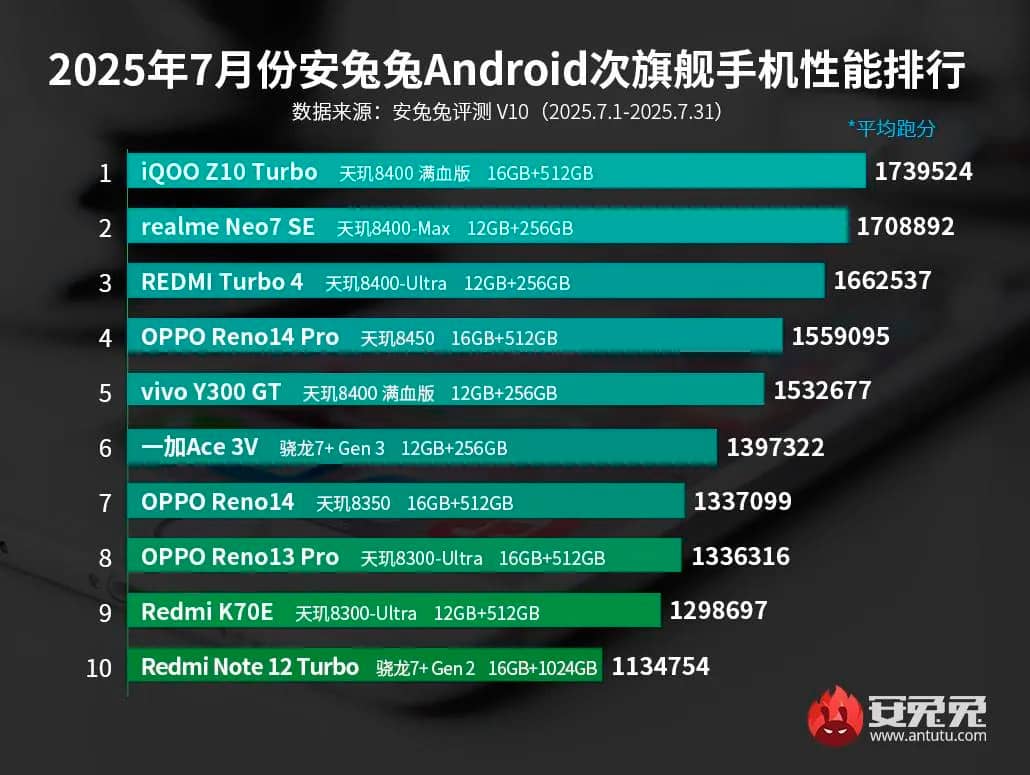 Лидером оказался iQOO Z10 Turbo, оснащенный разогнанной версией чипа Dimensity 8400 Full-Power Edition, набравший впечатляющие 1.739 млн баллов. На втором месте — Realme Neo7 SE с чипом Dimensity 8400-Max, показавший результат в 1.7 млн баллов. Третью позицию занял Redmi Turbo 4 на базе Dimensity 8400-Ultra, у которого 1.66 млн баллов.